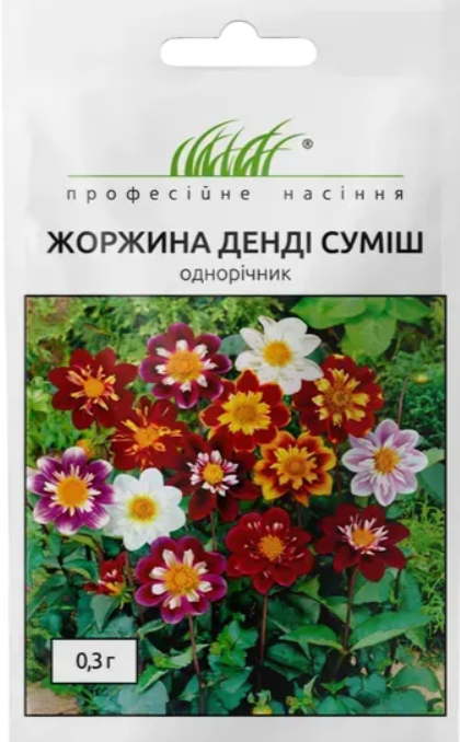 Жоржина низькоросла Денді (Dahlia variabilis Dandy). Однорічна культура висотою 30-40 см з двоколірними пелюстковими квітами. Рослини, висаджені одним масивом створюють яскраву мозаїку кольорів на вашій клумбі. Культура невибаглива у вирощуванні. Можна висівати безрозсадним способом у відкритий ґрунт. При загущенні посівів рослини проріджують і розсаджують на постійне місце. Період висіву насіння кінець квітня – початок травня. Для раннього цвітіння у теплиці або парники насіння висівають у березні – квітні у суміш торфу та піску (співвідношення 3:1). При температурі ґрунту +18 °С сходи з’являються на 7-14 день. Пікіровку проводять у фазі двох справжніх листків. На постійне місце висаджують після закінчення весняних приморозків.