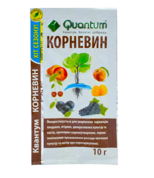 Квантум Корневин 10 г – нова формула кристалічного добрива «2 в 1» для домашнього застосування. Садівники можуть використовувати Корневин для рослин протягом всього року. У препарату дуже широкий спектр дії: взимку – для вкорінення живців, навесні – Корневином можна поливати розсаду. Найчастіше препарат застосовують в складних випадках – Корневин як стимулятор утворення й росту кореневої системи у «проблемного» посадкового матеріалу з підсохлими корінням. Ефект від обробки просто разючий – приживаються самі безнадійні саджанці, а для розсади троянд Корневин забезпечує формування перших бутонів вже в рік посадки.