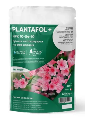 Plantafol 10-54-10 – високоефективне добриво для листових підгодівлі, що використовується для запуску фотосинтезу, активного росту і розвитку кореневої системи, в разі стресів (при екстремальному рівні рН грунту, підвищеної вологості або посухи, низьких температурах). А також в холодну пору року, при недостатньому засвоєнні елементів живлення з грунту. Попереджає дефіцит фосфору, підтримує оптимальний розвиток, бутонізації, цвітіння і зав´язь, відновлює слабке волокнисті коріння, уповільнює процеси старіння.